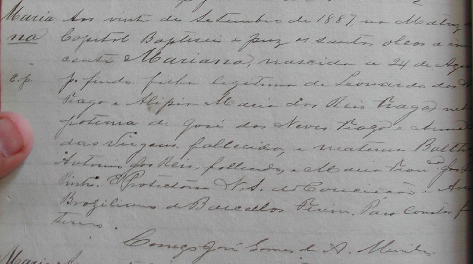 - Mariana, nascida no dia 24/08/1881, batizada no dia 20/09/1881, na Matriz de Vitoria-ES