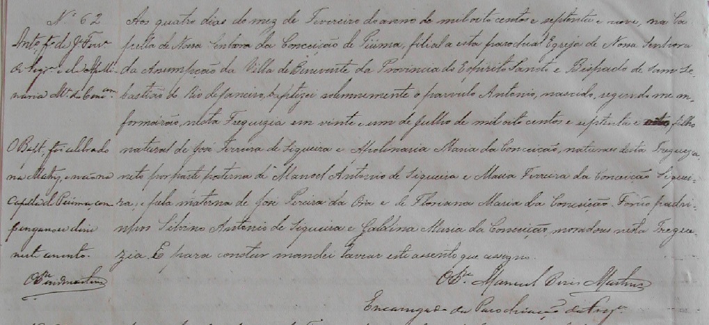 Padrinhos: Manoel Antonio de Siqueira Filho e sua mulher Francisca Maria da Conceição