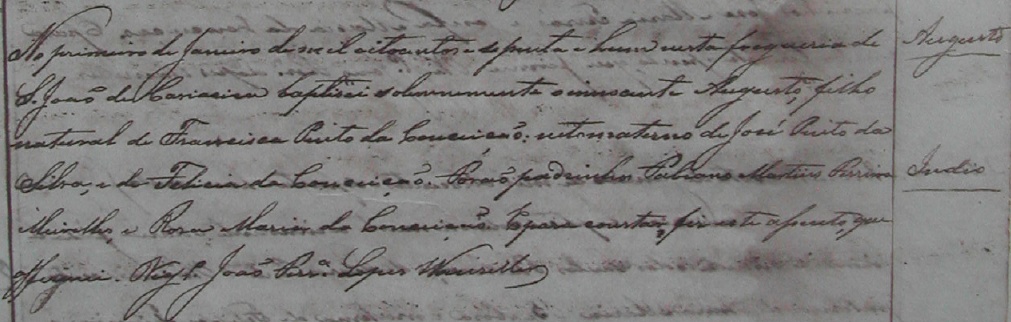 - Augusto (Indio - filho natural), batizado no dia 01/01/1861, na Freguezia de São João de Cariacica-ES