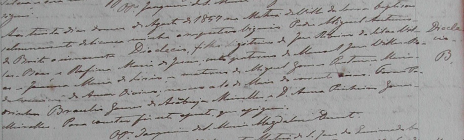 - Dioclecio, nascido no dia 10/05/1857, batizado no dia 30/08/1857, na Matriz da Vila da Serra-ES