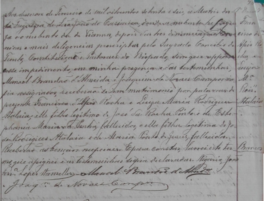 Francisco de Assis Rocha c.c. Luiza Maria Rodrigues Atalaia, filha de Jose Rodrigues Athalaia e Maria Pinta de Jesus