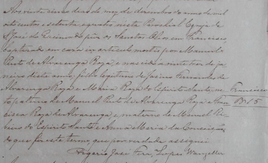 - Francisco, nascido no dia 23/01/1874, batizado no dia 25/12/1874, na Parochial Igreja de São Jose do Queimado-ES, batizado em casa inarticulo mortis por Manoel Pinto de Alvarenga Roza