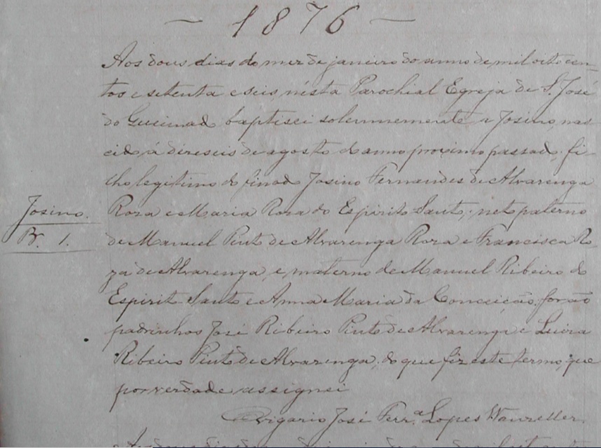- Josino, nascido no dia 16/08/1875, batizado no dia 02/01/1876, na Parochial Igreja de São Jose do Queimado-ES