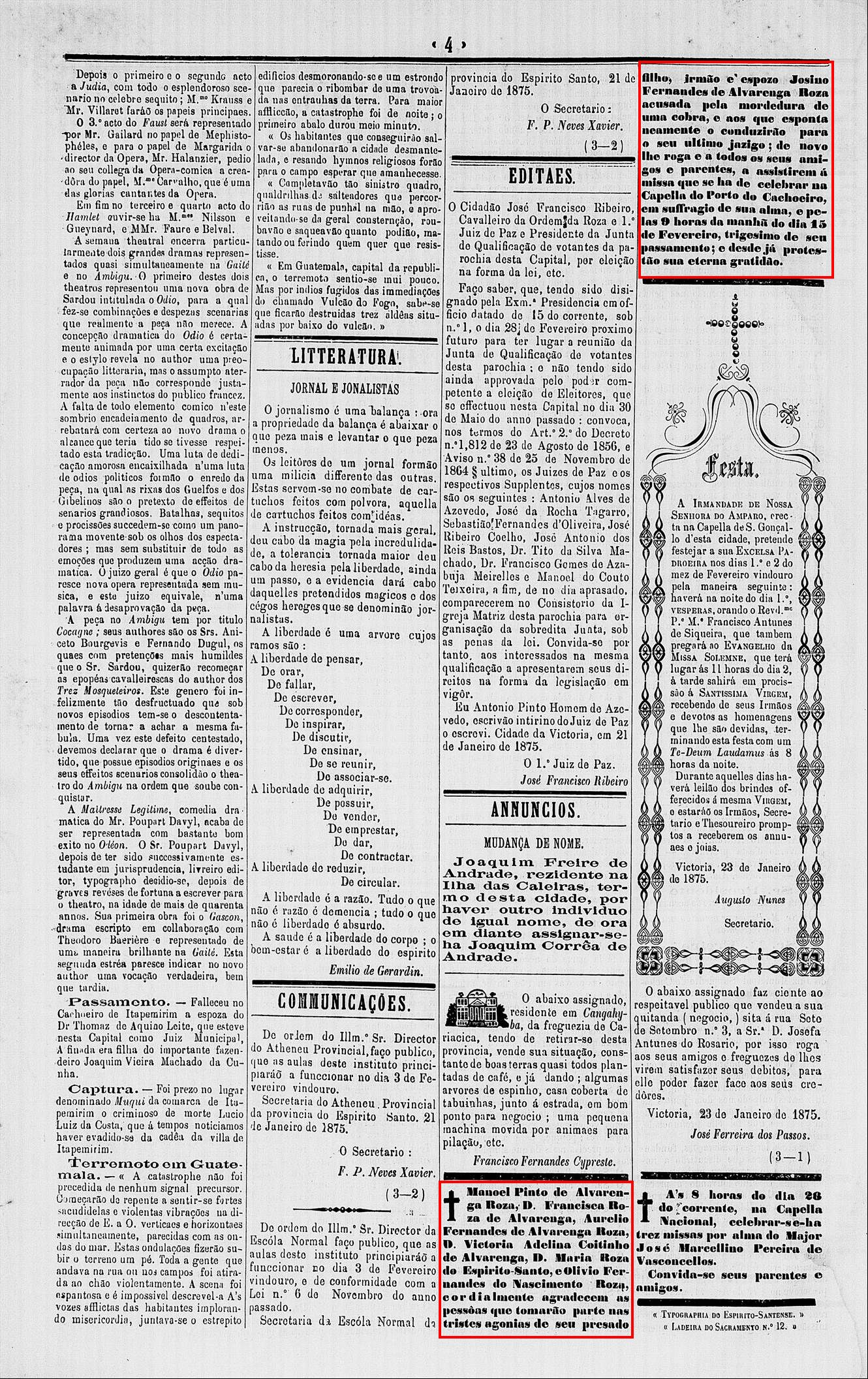 1875 - Falecimento de Josino Fernandes de Alvarenga Roza