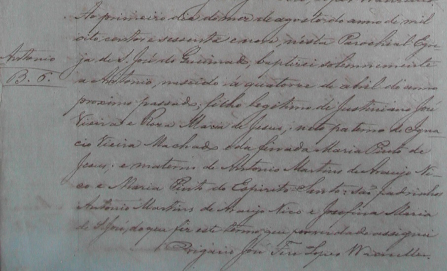 - Antonio, nascido no dia 14/04/1869, batizado no dia 01/08/1869, na Parochial Igreja de São Jose do Queimado-ES