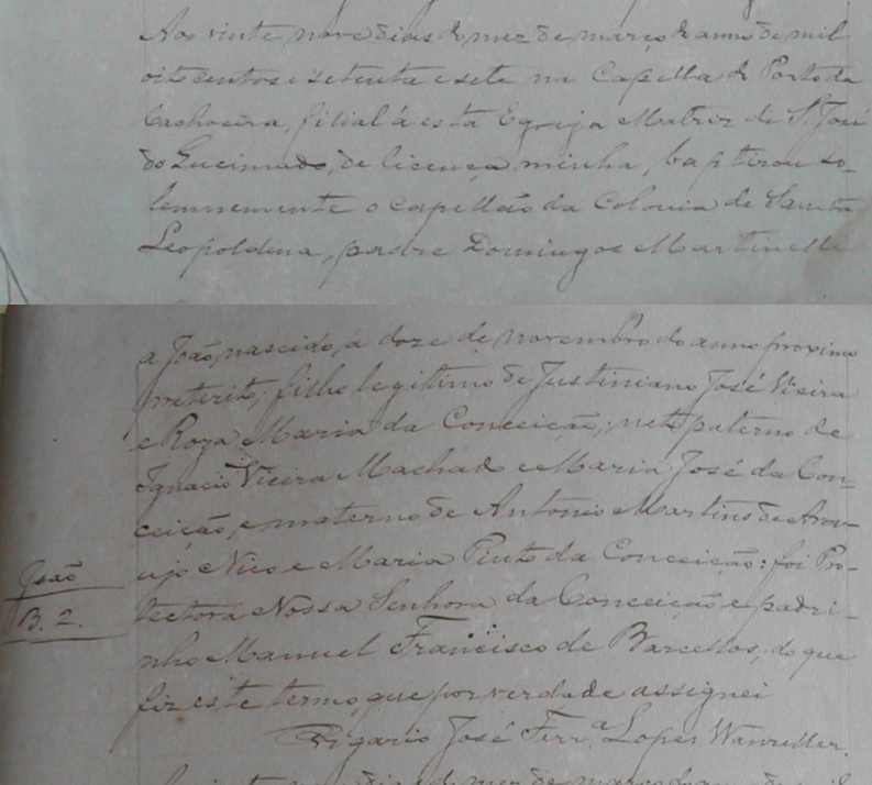 - João, nascido no dia 12/111876, batizado no dia 29/03/1877, na capela de Porto da Cachoeira, filial da Igreja Matriz de São Jose do Queimado-ES
