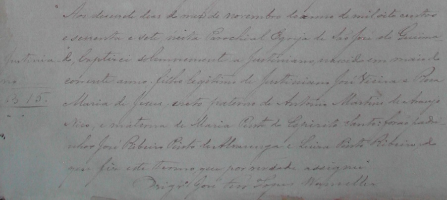 - Justinia, nascida em Maio/1867, batizada no dia 17/11/1867, na Parochial Igreja de São Jose do Queimado-ES