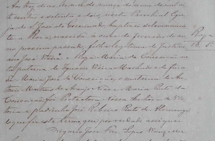 - Roza, nascida no dia 11/02/1872, batizada no dia 03/03/1872, na Igreja Parochial de São Jose do Queimado-ES