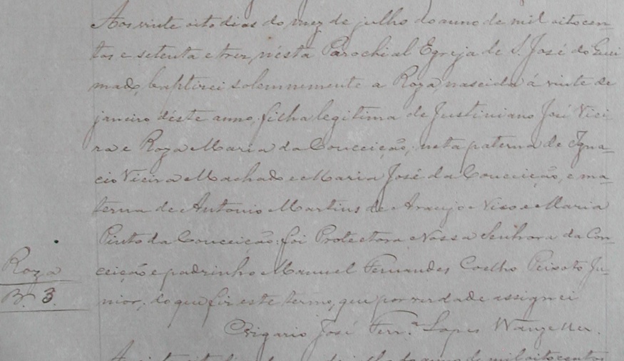 - Roza, nascida no dia 20/01/1873, batizada no dia 28/07/1873, na Igreja Parochial de São Jose do Queimado-ES
