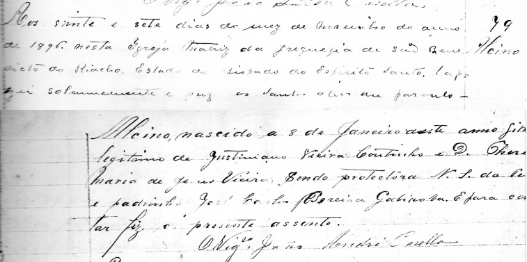 - Alcino, nascido no dia 08/01/1896, batizado no dia 27/11/1896, na Igreja Matriz da Freguezia de São Benedito de Riacho-ES