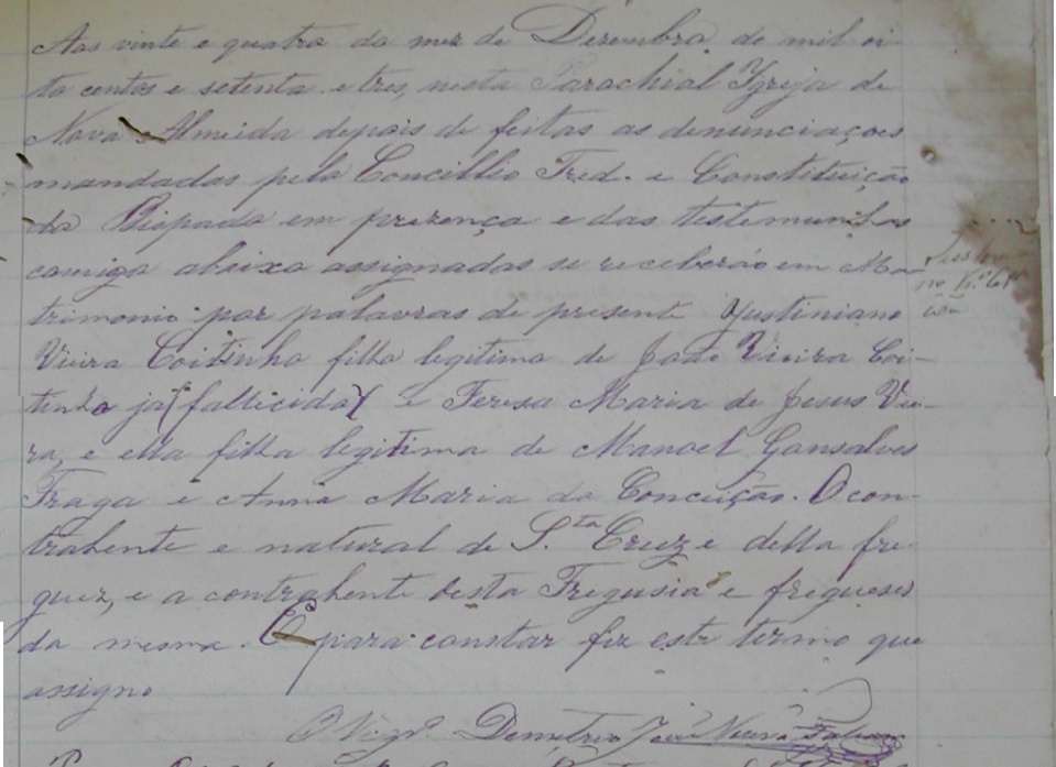 Casaram-se no dia 24/12/1873, na Parochial Igreja de Nova Almeida-ES