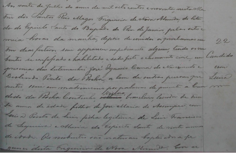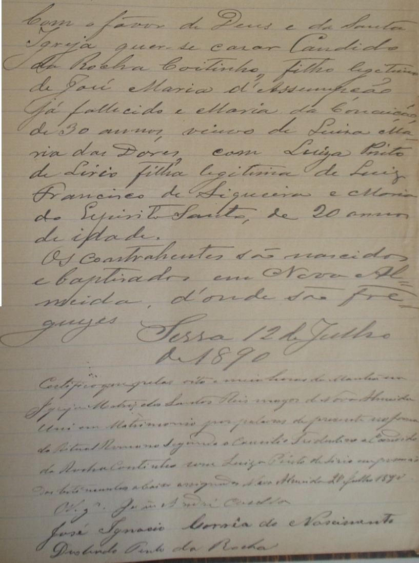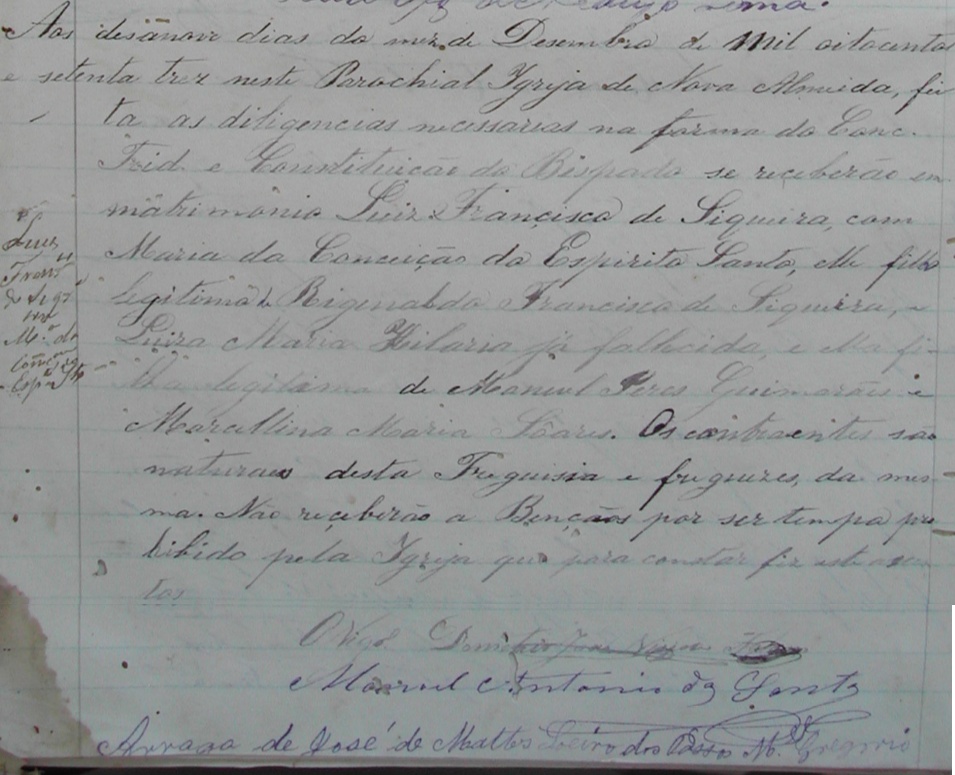 Casaram-se no dia 19/12/1873, na Parochial Igreja de Nova Almeida-ES, naturais de Nova Almeida-ES