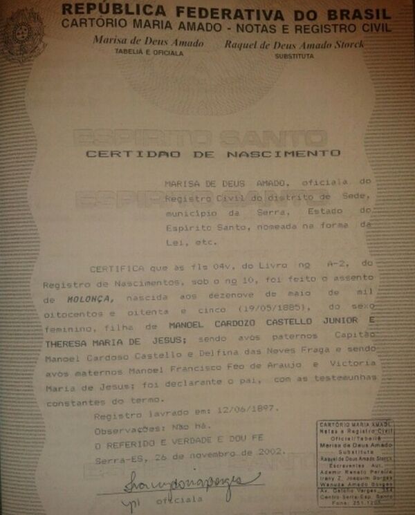 - Molonça - Nascida no dia 19/05/1885 - CERTIDÃO DE BATISMO