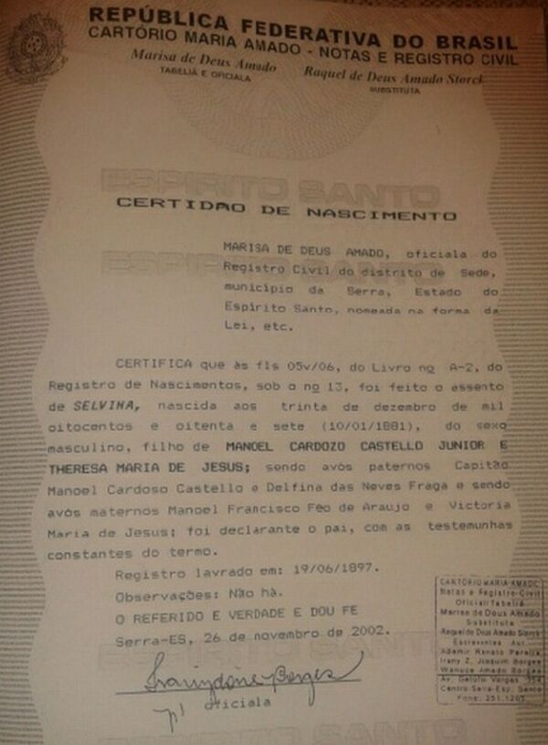 - Servina, nascida no dia 01/09/1885,batizada no dia 07/01/1886, na Igreja Matriz da Freguezia de Nossa Senhora da Serra-ES