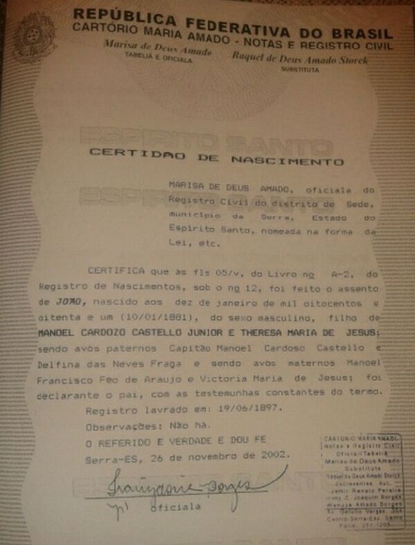 - João, nascido no dia 22/03/1881, batizado no dia 29/05/1881, na Matriz de São Jose do Queimado-ES (registrado no livro da Serra-ES)