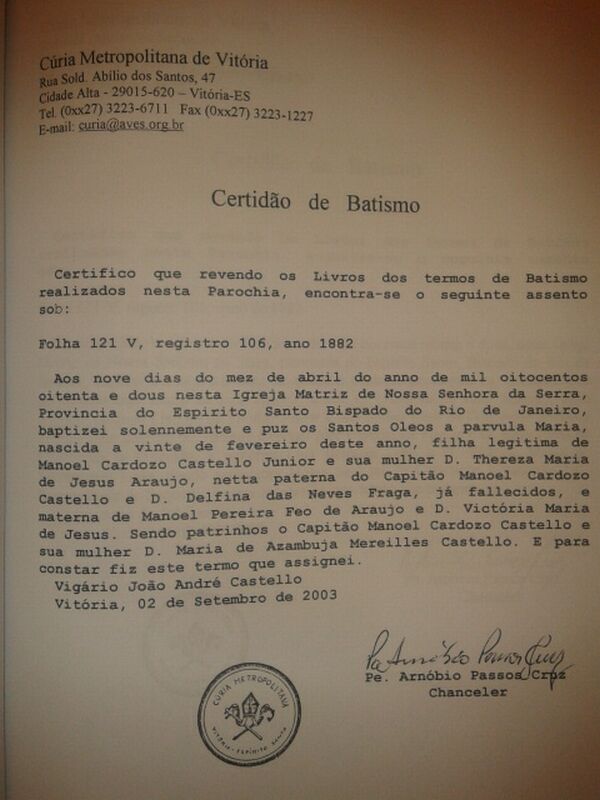 - Maria - batizada no dia 09/04/1882, na Matriz da Serra-ES, nascida no dia 20/02/1882