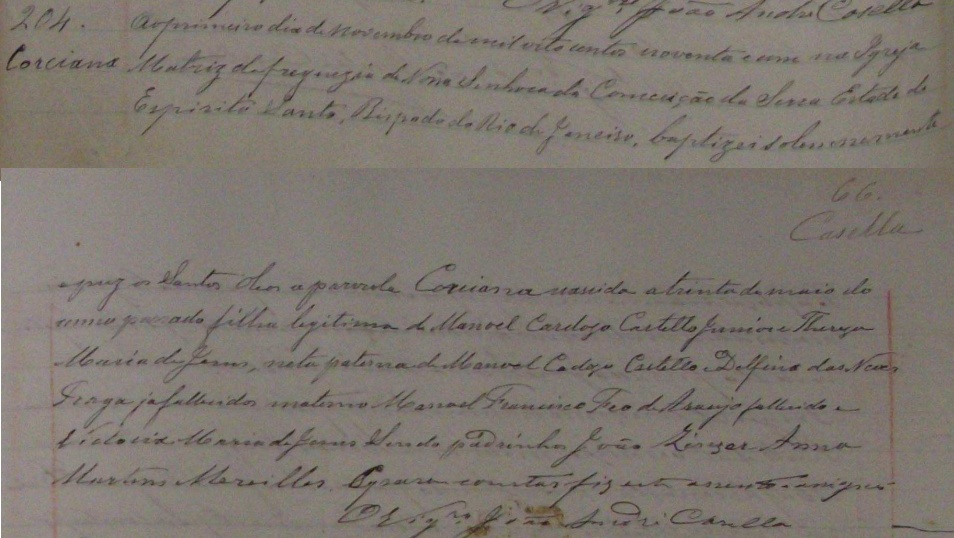 - Corciana, nascida no dia 30/05/1890, batizada no dia 01/11/1891, na Igreja Matriz da Freguezia de Nossa Senhora da Serra-ES