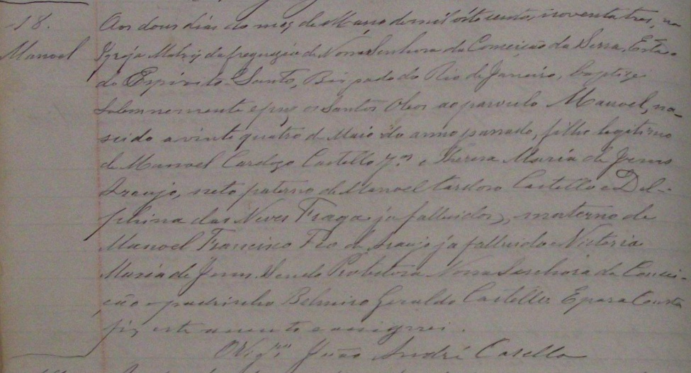 - Manoel, nascido no dia 24/05/1892, batizado no dia 02/03/1893, na Igreja Matriz da Freguezia de Nossa Senhora da Serra-ES
