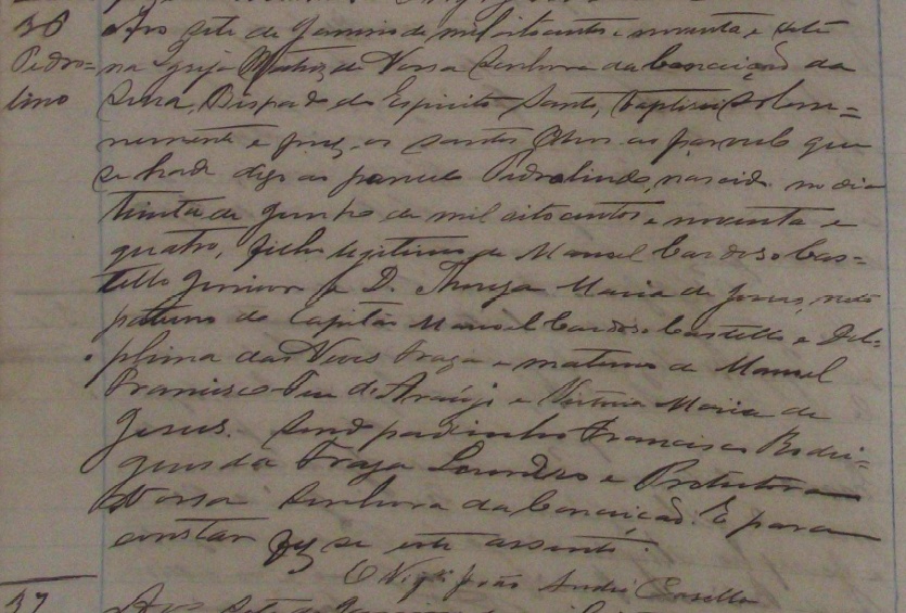 Em 1878 estava com 34 anos de idade, viuvo, lavrador, sabia ler, filho de Manoel Cardozo Castelo,