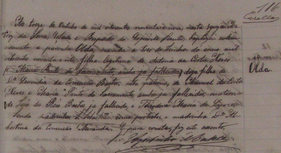 - Olda, nascida no dia 03/06/1898, batizada no dia 13/10/1899, na Igreja Matriz da Serra-ES