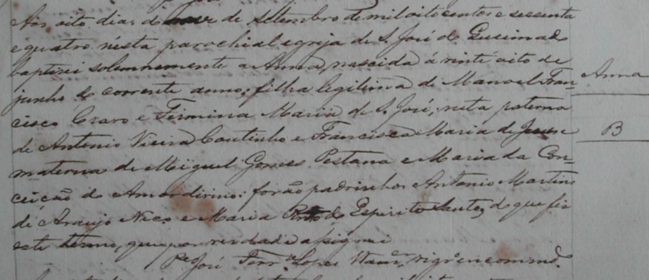 - Anna, nascida no dia 28/06/1864, batizada no dia 08/09/1864, na Parochial Igreja de São Jose do Queimado-ES