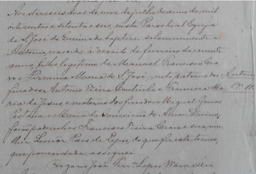 Padrinhos: Antonio Vieira Coutinho e sua mulher Francisca Maria de Jesus (Avós paternos)