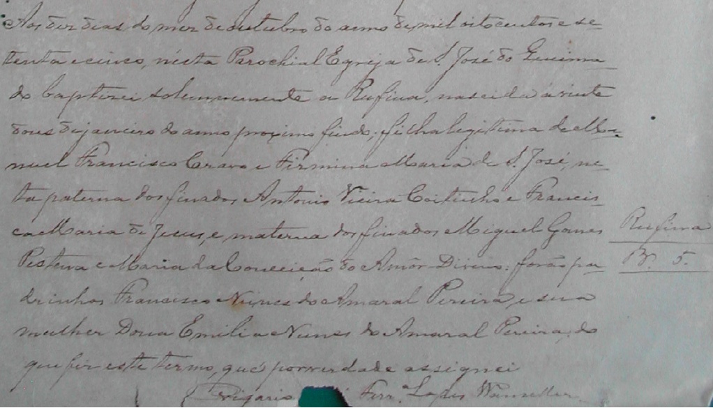- Firmina, batizada no dia 10/09/1875, na Parochial Igreja de São Jose do Queimado-ES