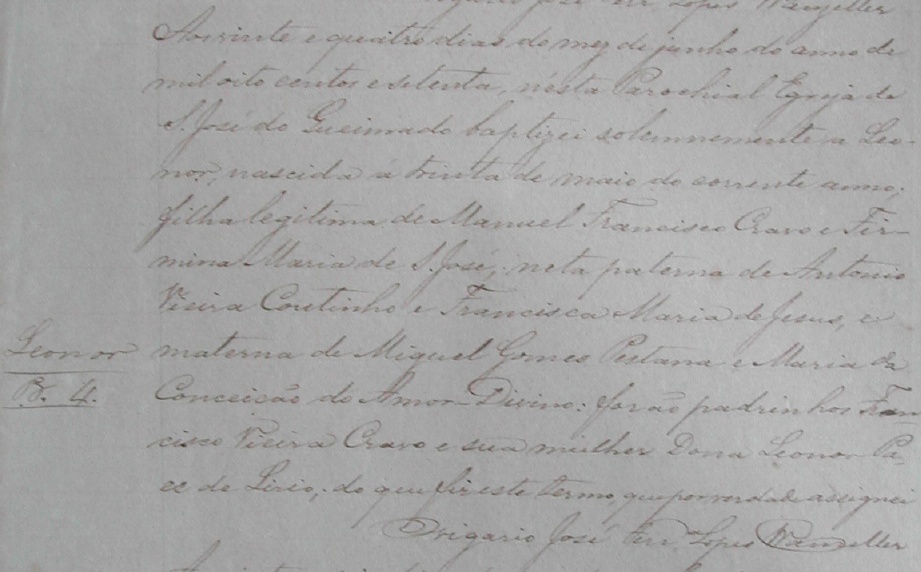 - Leonor, nascida no dia 30/05/1870, batizada no dia 24/06/1870, na Parochial Igreja de São Jose do Queimado-ES