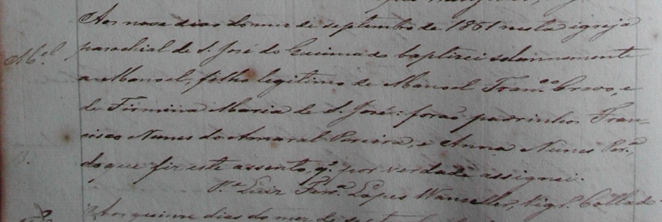 - Manoel, batizado no dia 09/09/1861, na Parochial Igreja de São Jose do Queimado-ES