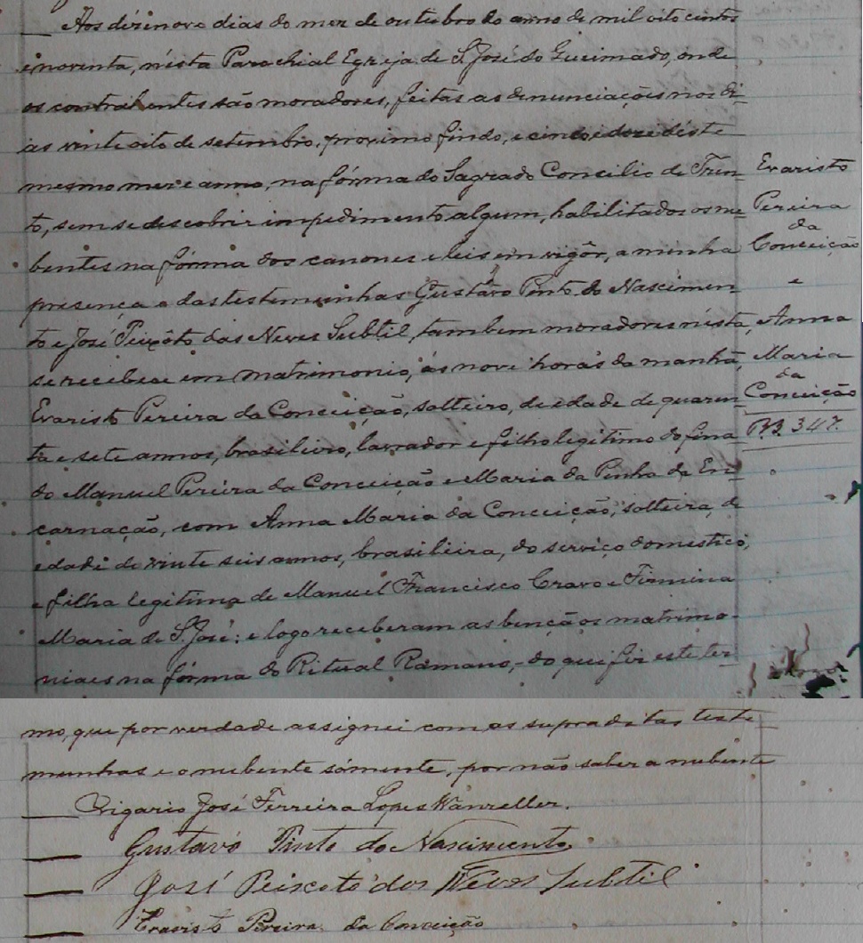 Anna Maria da Conceição c.c. Evaristo Pereira da Conceição, filho de Manoel Pereira da Conceição (Já falecido em 19/10/1890) e Maria da Penha da Encarnação