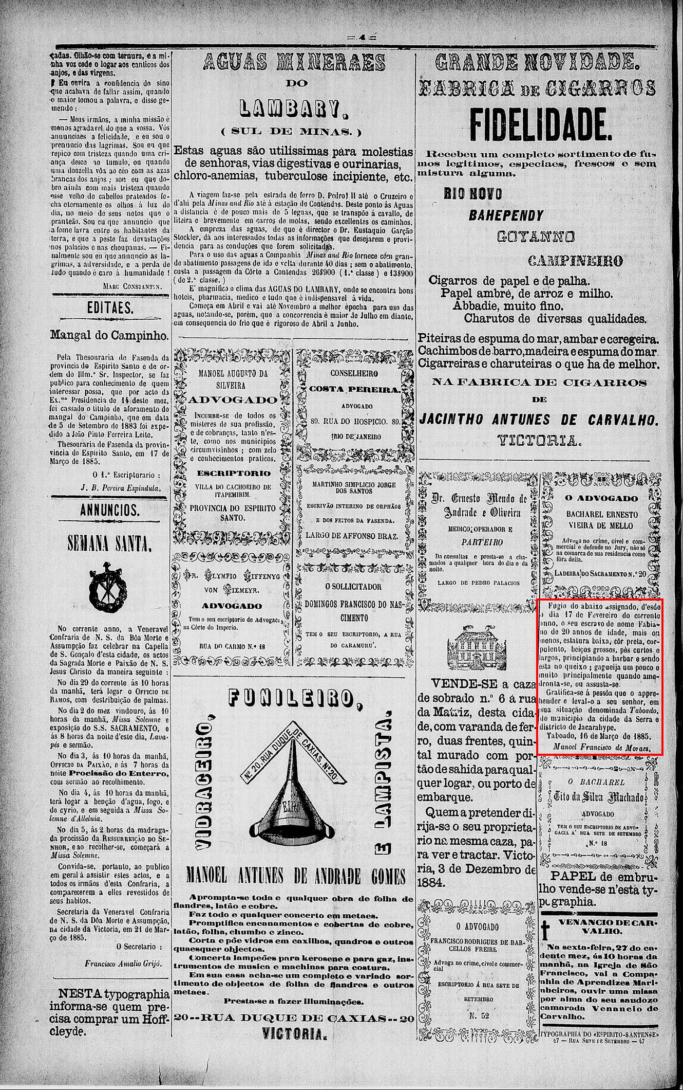 Em 1885 fugiu o seu escravo Fabiano, de 20 anos de idade, da localidade Taboado-Jacaraipe-ES