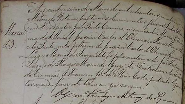 Maria, batizada no dia 25/03/1849, na Matriz de Vitoria-ES Padrinho: Francisco Jose de Abreu Costa [Batismo: Vitória B19-08.1841-09.1851 - página: E210]