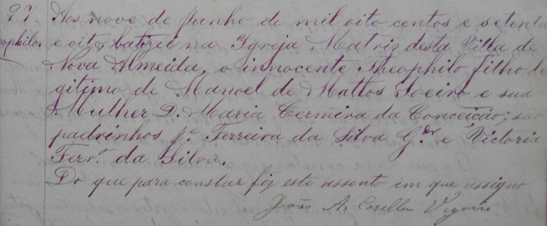 - Theophilo, batizado no dia 09/06/1878, em Nova Almeida - ES
