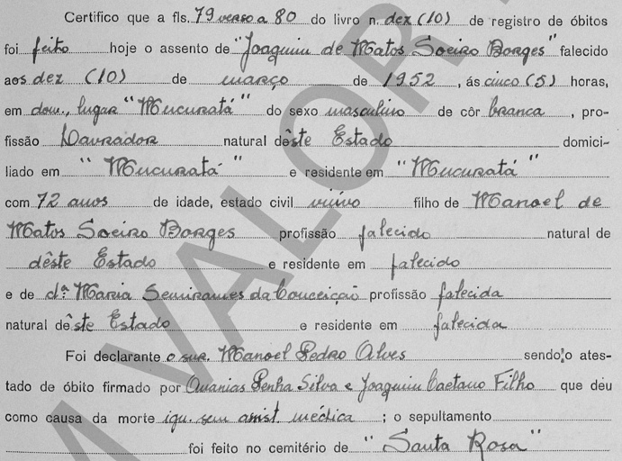 Faleceu no dia 10/03/1952, às 5 horas, com 72 anos de idade, viúvo, em Mucurata, Aracruz-ES