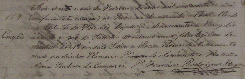 - Emydio, nascido no dia 07/01/1902, batizado no dia 26/02/1902, na Fazenda denominada Novo Mundo, no Distrito de Fundão-ES
