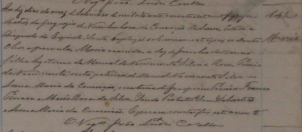 - Maria, nascida no dia 10/06/1897, batizada no dia 10/09/1897, na Igreja Matriz da Freguezia de Nossa Senhora da Conceição da Serra-ES