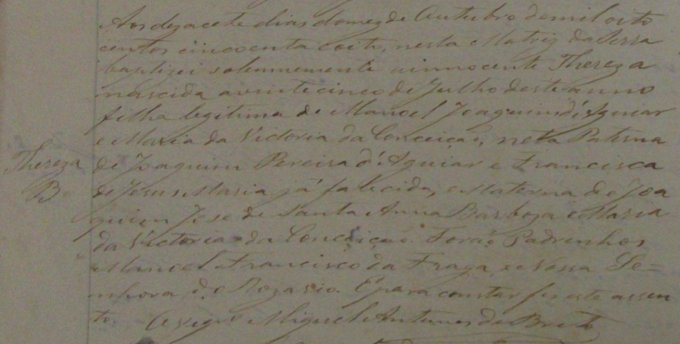- Thereza, nascida no dia 25/07/1858, batizada no dia 17/10/1858, na Matriz da Serra-ES