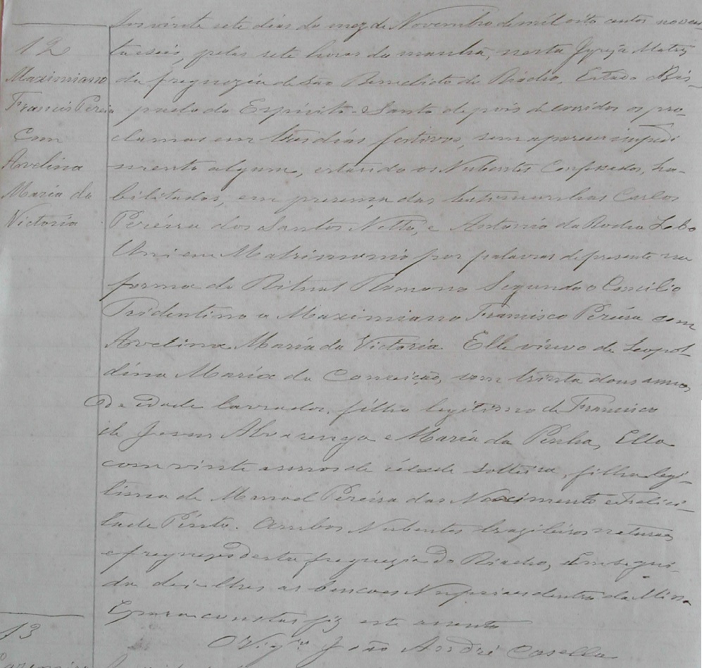 Maximiano Francisco Pereira, com 32 anos de idade, viuvo de Leopoldina Maria da Conceição, filho de Francisco de Jesus Alvarenga e Maria da Penha