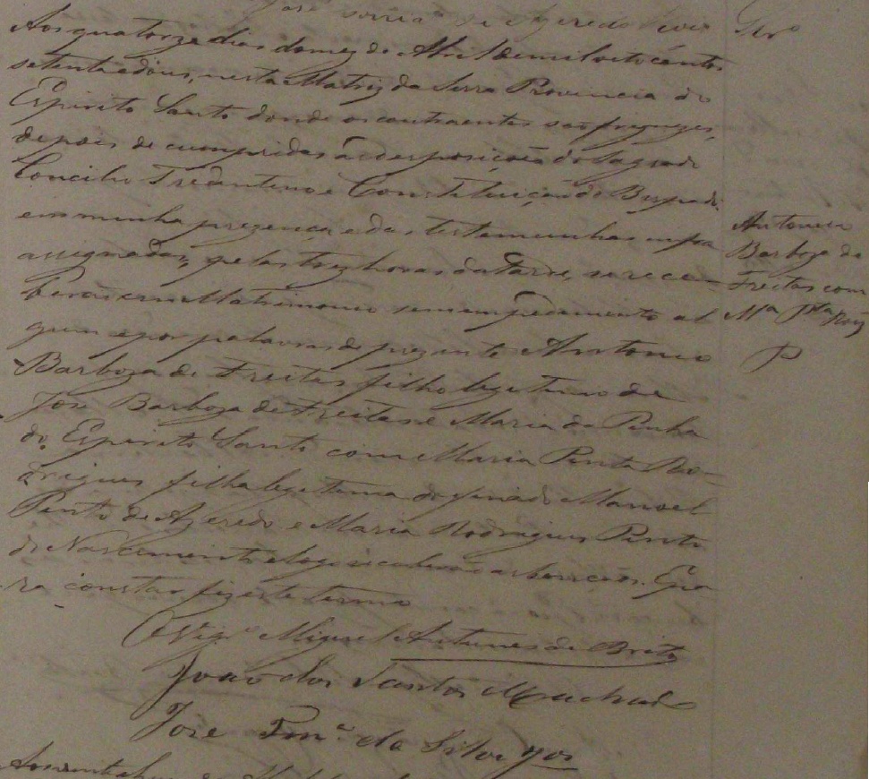 Maria Pinto Rodrigues c.c. Antonio Barboza de Freitas, filho de Jose Barboza de Freitas e Maria da Penha do Espirito Santo