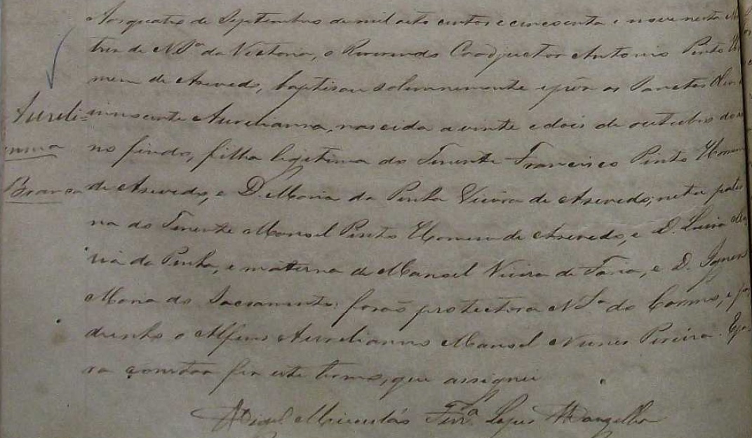 - Aureliana, nascida no dia 22/10/1858, batizada no dia 04/09/1859, na Matriz de Nossa Senhora da Vitotia-ES