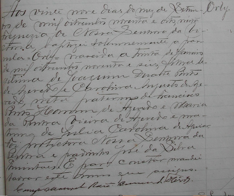 - Orly, nascida no dia 30/01/1896, batizada no dia 29/09/1898, na Freguezia de Nossa Senhora da Vitoria-ES