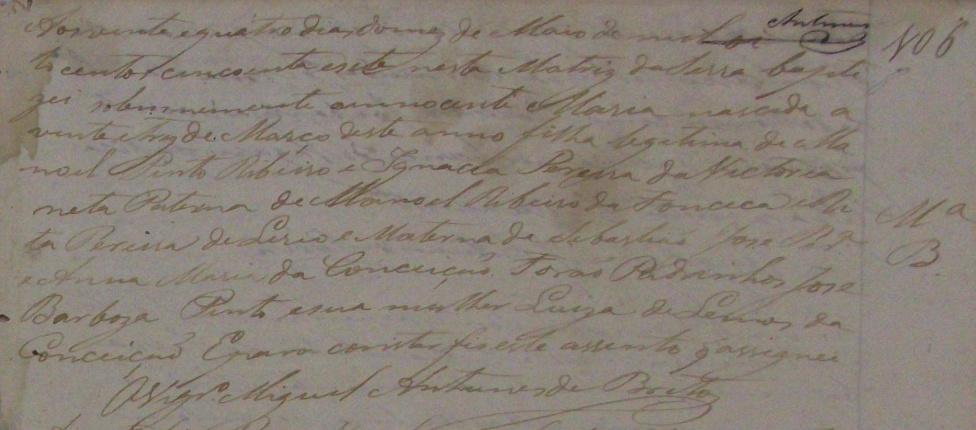 Padrinhos: Jose Barboza Pinto e sua mulher Luiza de Lemos da Conceição
