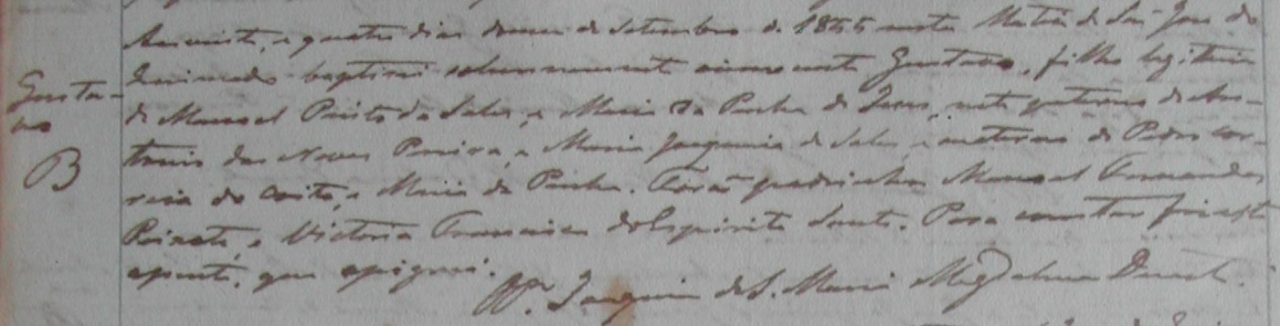 Gustavo, batizado no dia 24/09/1855, na Matriz de São Jose do Queimado-ES