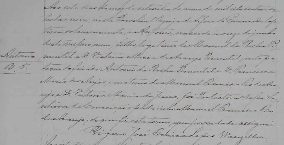 - Antonio, nascido no dia 11/06/1879, batizado no dia 07/09/1879, na Parochial Igreja de São Jose do Queimado-ES