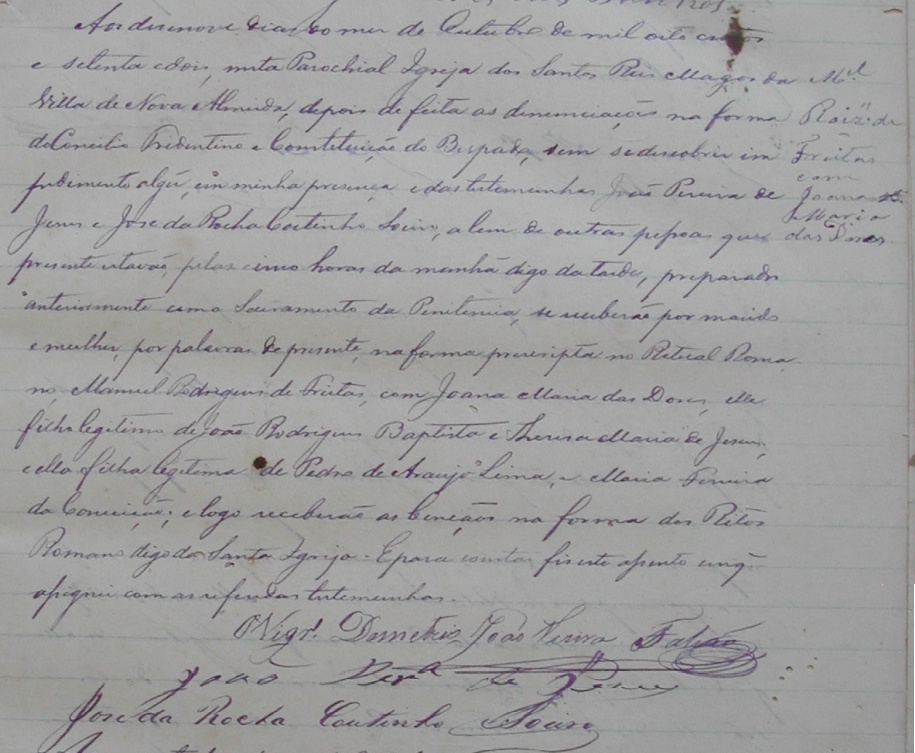 Casaram-se no dia 19/10/1872, na Parochial Igreja dos Santos Reis Magos da Vila de Nova Almeida-ES, pelas 5 horas da tarde