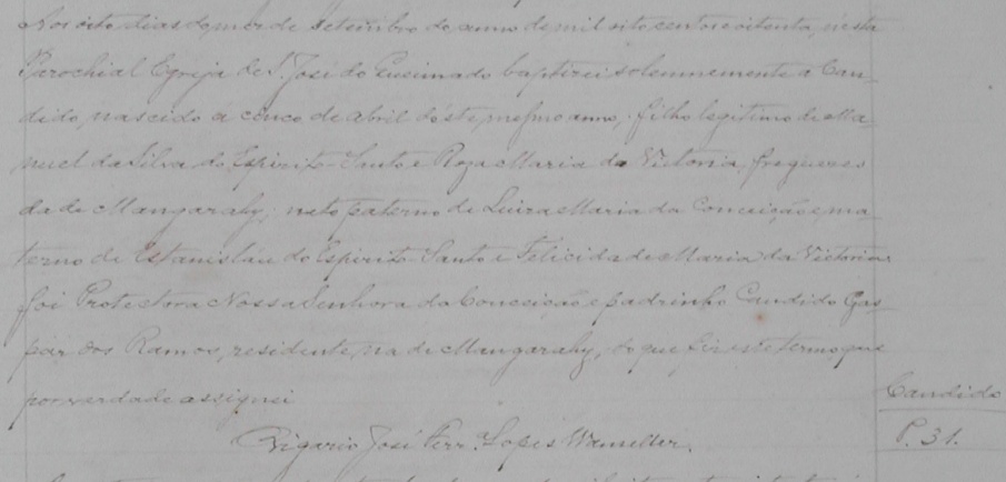 - Candido, batizado no dia 08/09/1880, na Parochial Igreja de São Jose do Queimado-ES