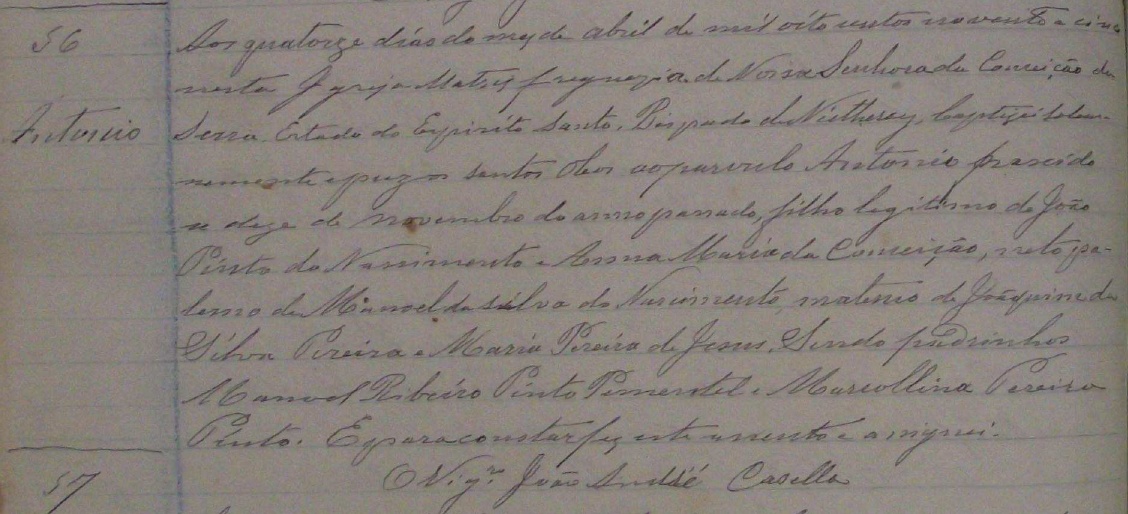 - Antonio, nascido no dia 10/11/1894, batizado no dia 14/04/1895, na Igreja Matriz da Freguezia de Nossa Senhora da Conceição da Serra-ES
