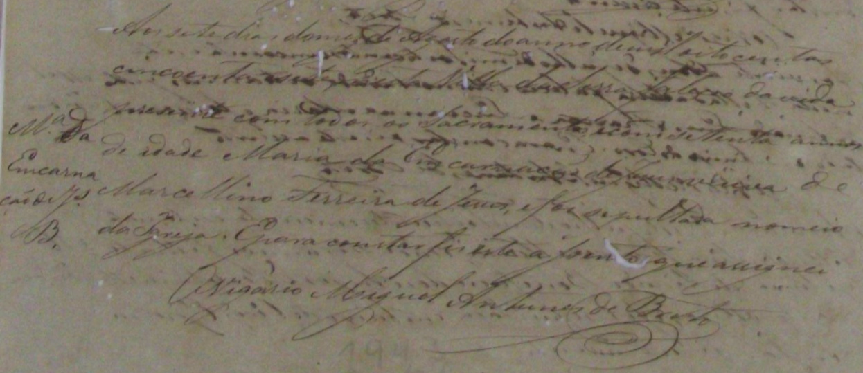 Aos 07/08/1857, na Vila da Serra-ES, com 70 anos de idade, faleceu Maria da Encarnação de Jesus, viúva de Marcellino Ferreia de Jesus