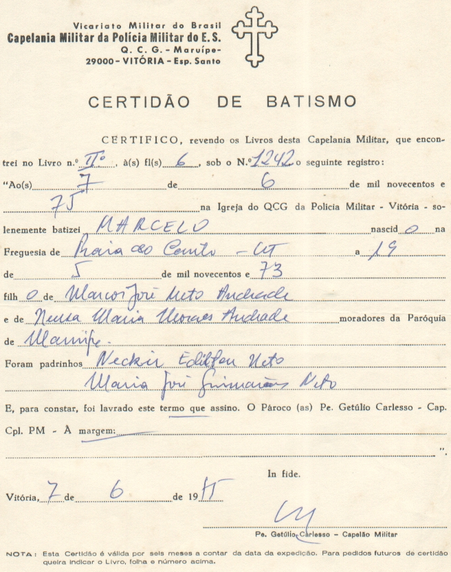 Pais: Marcos Jose Neto Andrade e Neusa Maria Moraes Andrade