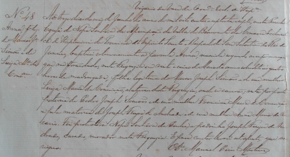- Anna, nascida no dia 25/05/1877, às 4 horas da madrugada, batizada no dia 13/06/1877, na Parochial Igreja de Nossa Senhora da Assumpção da Vila de Benevente da Comarca de Itapemirim-ES